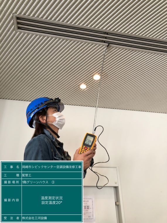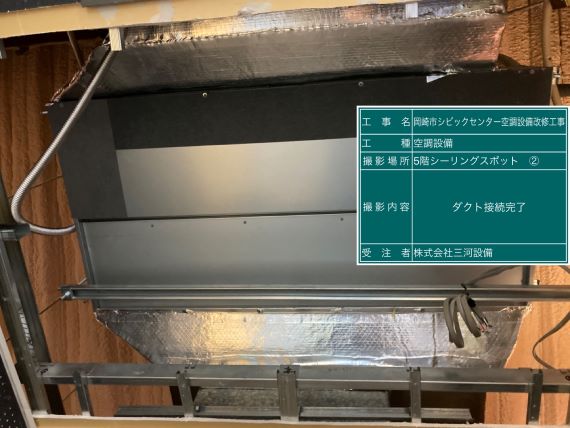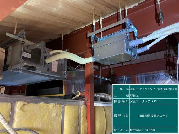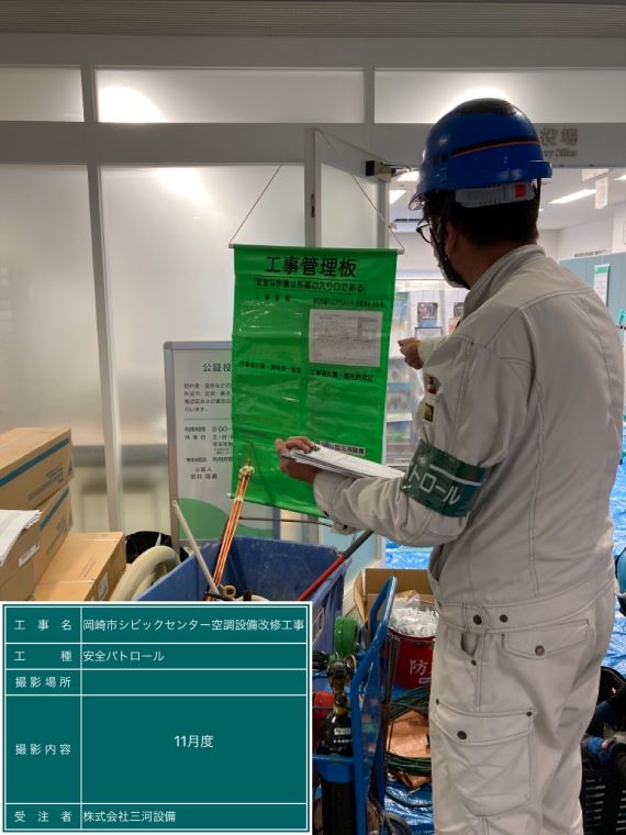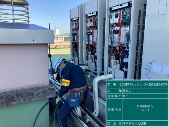 岡崎市シビックセンター空調設備改修工事 2021.11.30更新 【工事名称】 岡崎市シビックセンター空調設備改修工事 【工 期】 令和3年7月2日から令和3年11月30日まで 【発注機関】 岡崎市 【2021年11月【完成】】 機器設置工 ポンプ芯出し状況 ![]() 機械設置工 ポンプ設置完了 ![]() 電気工 配線接続状況 ![]() 配管工 冷媒配管接続施工完了 ![]() 空調設備 ダクト接続完了 ![]() 検測 軽量下地 ![]() 配管工 温度測定 ![]() 安全パトロール ![]() |